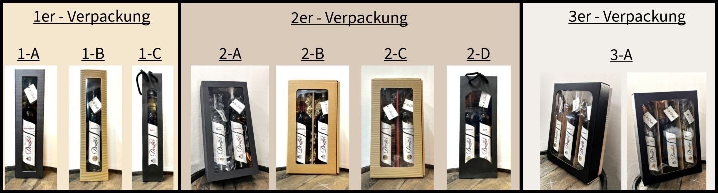Für unsere langen 500 ml- und 700 ml-Flaschen haben wir eine größere Auswahl an postversandgeeigneten Präsent-Verpackungen: