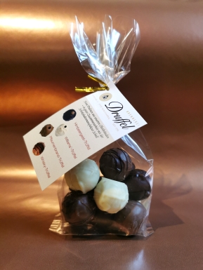 Die Pralinen sind in einem Klarsichttütchen mit Produktanhänger verpackt.